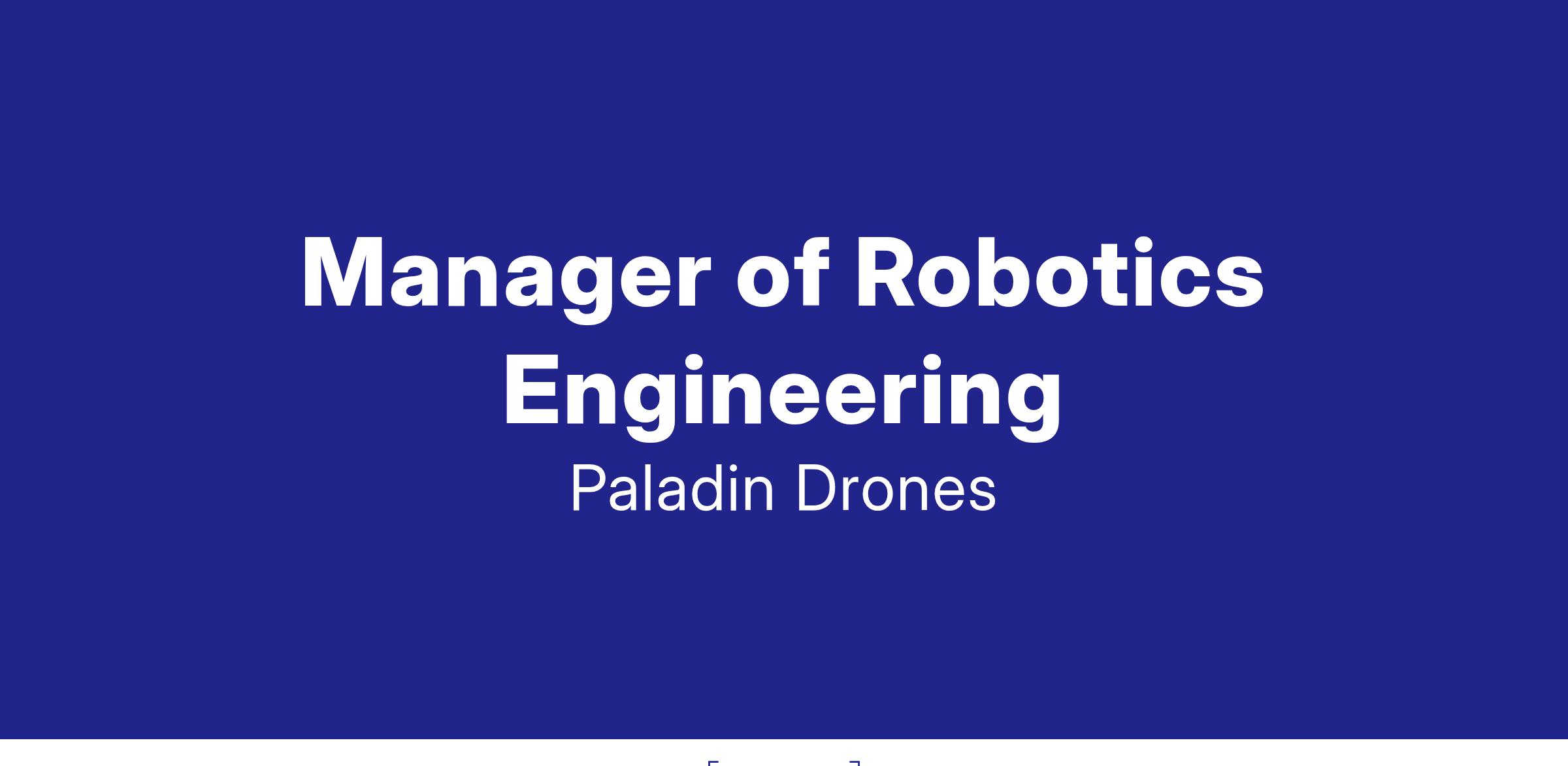 We’re looking for a Manager of Robotics Engineering to lead the charge on autonomy, perception, and flight control for Paladin’s drones. This is not just a management role — it requires strong individual contributor roots and architectural depth. You’ll be responsible for building systems that perform in complex, mission-critical scenarios, and you’ll help scale the team to meet increasing demand across public safety.