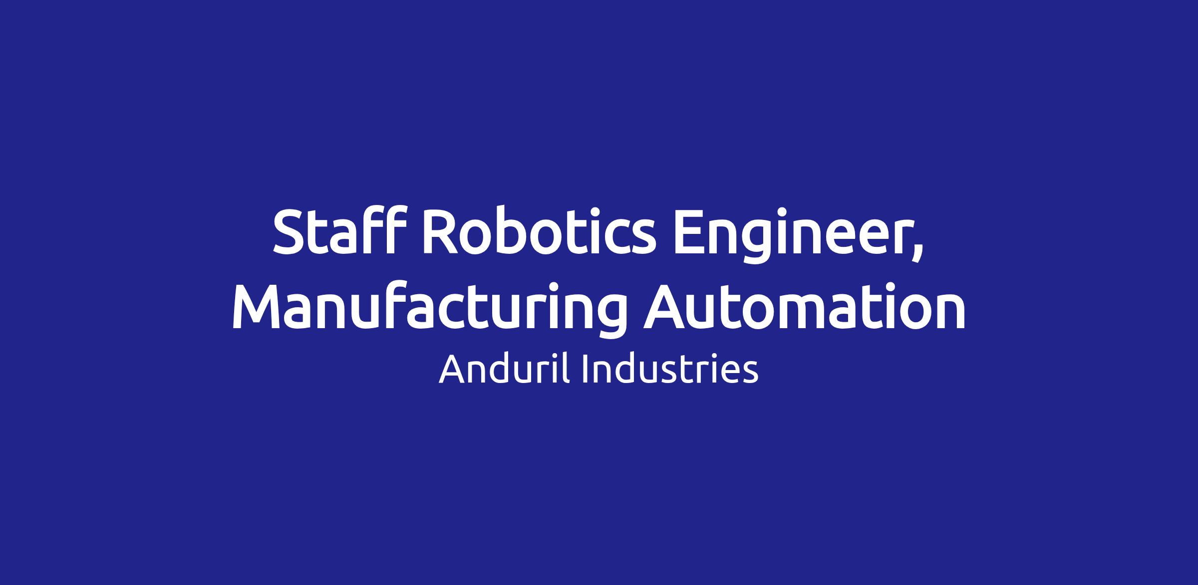 Anduril’s Manufacturing Automation team is seeking a Staff Robotics Engineer to join our team. The Manufacturing Automation team is responsible for the design, integration, and deployment of automated manufacturing systems across Anduril factories. As a member of this team, you will have the opportunity to help define what production automation looks like for Anduril at a national scale.
